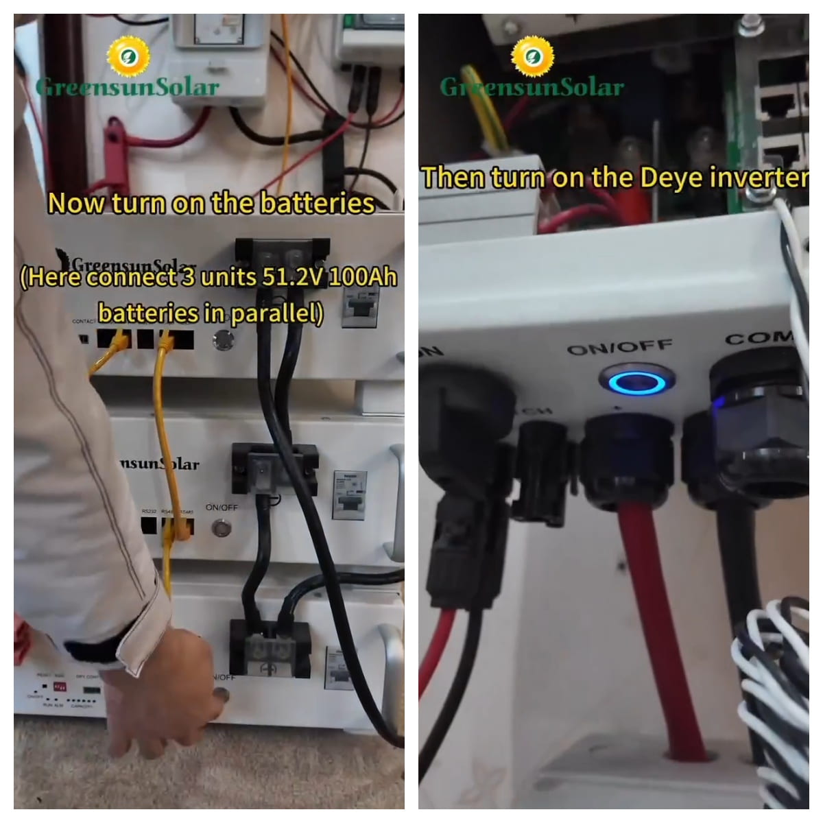 2. Turn on the batteries(3 unit 51.2v 100ah batteries in Parallel), and then turn on the Deye inverter.